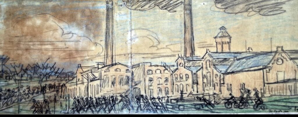 In hoofdzakelijk houtskool met wat krijt heeft Toorop een dor fabriekslandschap neergezet. DRU arbeiders verlaten massaal de fabriek evenals de grote rookpluimen uit de schoorstenen.