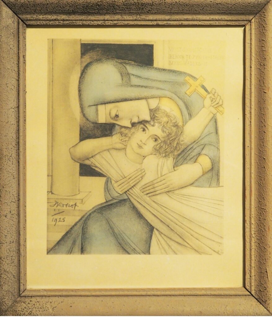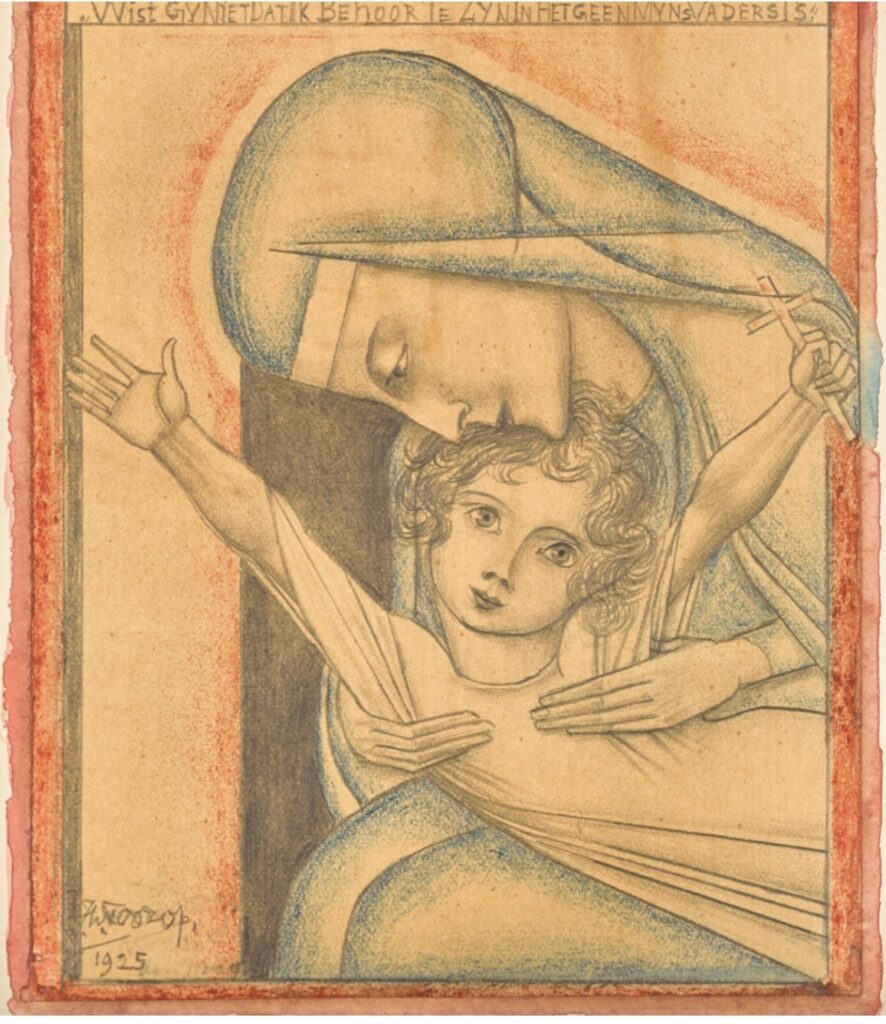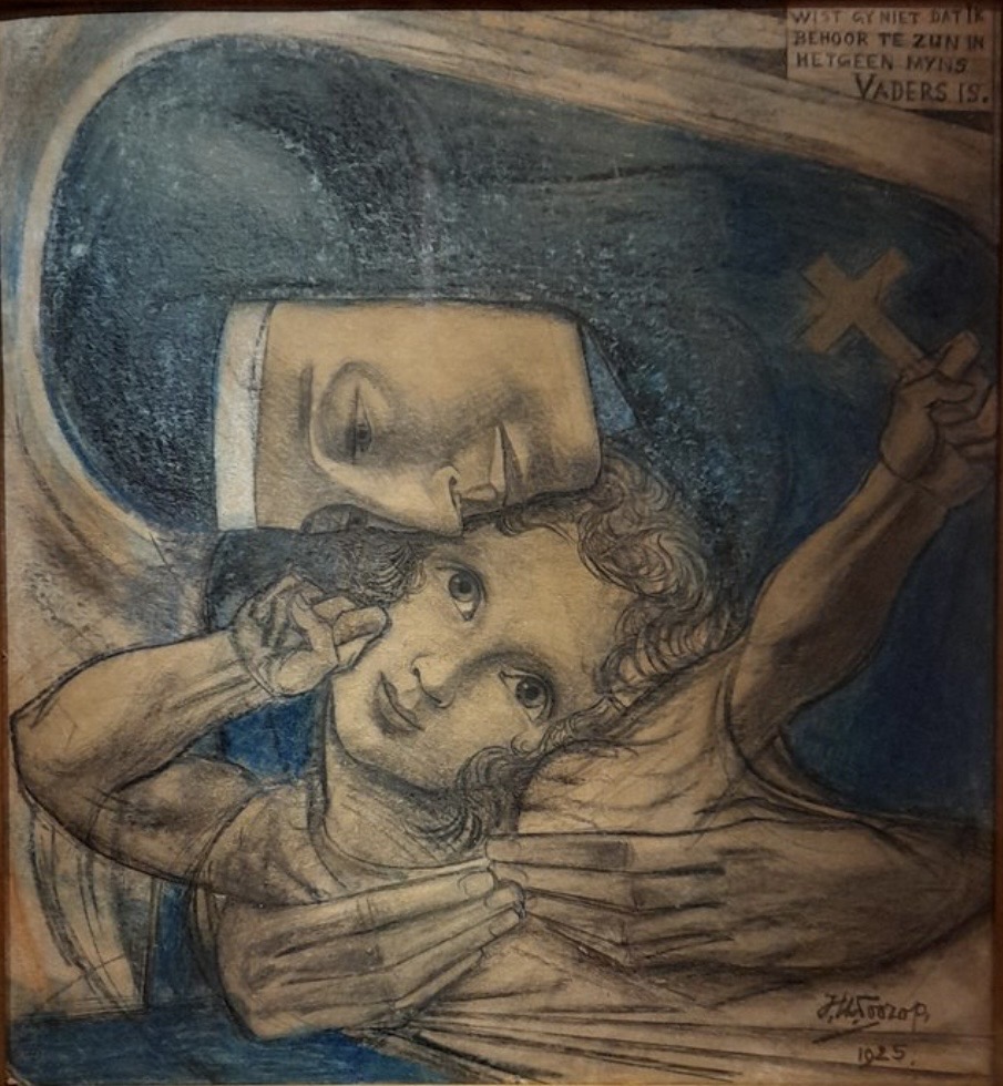 Toorop vervaardigde in 1925 meerdere werken met soortgelijke afbeelding als hierboven afgebeeld. Over het algemeen grafisch werk waaronder litho’s en isografiën met o.a. als titels “Terugvinding” en “Neerziende Madonna”.