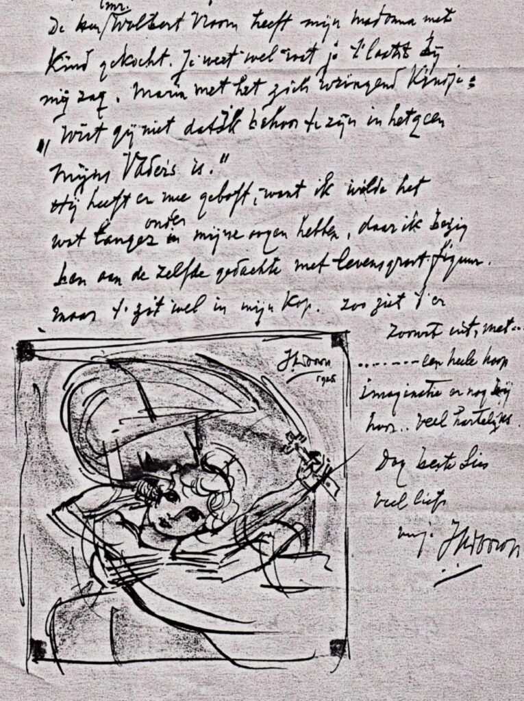“De heer Mr. Wolbert Vroom heeft mijn Madonna met Kind gekocht, je weet wel wat je ‘t laatst bij mij zag, Maria met het zich wringend kindje: “Wist gy niet dat ik behoor te zijn in hetgeen mijn Vaders is” Hij heeft er mee geboft, want ik wilde het langer onder in mijne ogen hebben, daar ik bezig ben aan de zelfde gedachte met levensgroot figuur. Maar ‘t zit wel in mijn kop.