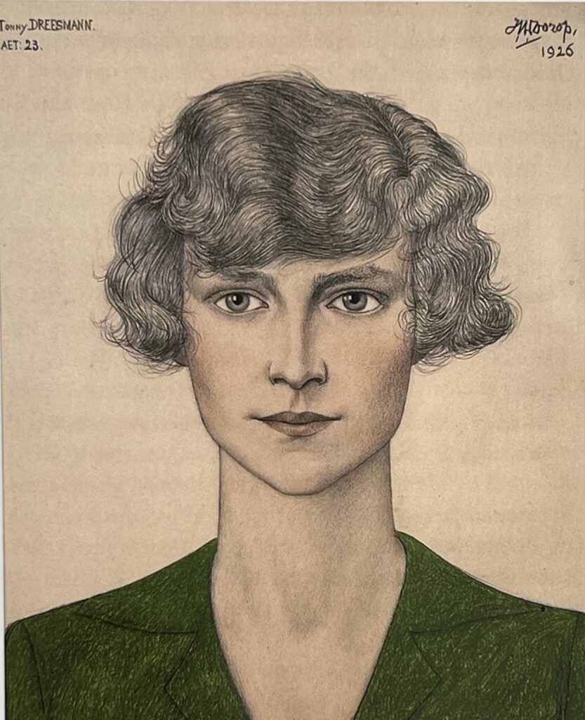 Dit elegante portret van Tonny Dreesmann (1902-1976) werd gemaakt naar aanleiding van haar verloving in januari 1926. Opdrachtgever was de verloofde, mr. Wolbert J. Vroom (1898-1973), die de kunstenaar kende. Op 30 januari schreef Toorop een bedankje aan Vroom voor het verzenden van verlovingskaartjes. Graag zou hij eens kennis willen maken met diens “aanstaande”. Kennelijk is de opdracht snel daarna verstrekt en ook snel uitgevoerd. Al op 2 april kon Toorop schrijven dat hij het portret de dag tevoren naar Vrooms adres in Amsterdam had laten zenden door Saritjan, zijn Javaanse lijstenmaker. “ De groene blouse doet er uitstekend om, vind ik en de lijst doet er ook heel goed om” aldus vertrouwt Toorop Vroom in dezelfde brief toe: heel veel kunstvrienden vonden het zo’n prachtig, pittig en Frisch en opgewekt schilderij, zonder haar te kennen. Ik zou haar nog wel eens willen teekenen, zoo in kleur. Ik heb er zelf heel groot genoegen in de teekening nu die in de lijst zit. Het maken van deze volgens hem “uitstekende” lijst waarin het portret nog altijd bewaard wordt, kostte 35 gulden, zo besluit Toorop zijn brief. Voor het portret betaalde Vroom blijkens een kasboekje 750 gulden. Al op 16 april 1926 bedankt Toorop hem voor de toegezonden postcheque. Hij is blij dat het portret bevalt, maar had dat wel verwacht want hij heeft het met verbazend veel liefde & sterke spanning geteekend”. “Als u nog iemand anders weet van die leeftijd ongeveer, dan zal ik die eveneens willen teekenen” , laat hij Vroom vervolgens weten, met een korte maar krachtige toelichting: “Zulke koppen zijn de moeite waard te teekenen. Een schoone & pittige lente”.