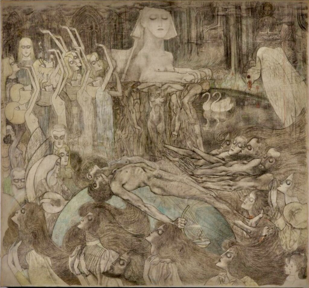 Origineel werk van Jan Toorop Coll. Kunstmuseum Den Haag, 126 x 135 cm, zwart en kleurkrijt,potlood,dekverf en gouache op geprepareerd linnen oorspronkelijke datering 1892