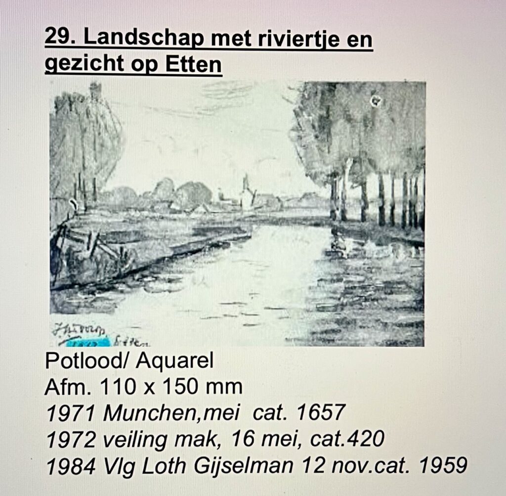 Gedurende Toorop’s Nijmeegse periode bezocht hij geregeld de families Deurvorst in Ulft maar ook in Terborg. In deze omgeving maakte hij ook diverse aquarel werken ‘en plein air’ van het Achterhoekse landschap. In de 70er-en 80er jaren kwamen deze veelal kleine werken in de verkoop middels diverse veilingen. Van de veilingnrs. 28 en 31 zijn helaas geen afbeeldingen bekend. Waarschijnlijk zijn deze kleine briefkaart formaat werken afkomstig van de derde zoon Lut Deurvorst, hij stierf in 1977 en was ongehuwd. Met dank aan dhr. Bodewes voor zijn research Een zoektocht naar Jan Toorop. Kunstenaar Bernard van Vlijmen (1895-1977) maakte evenals Toorop een werk vanaf Terborgse zijde uitkijkend op de kerk in Etten, met als titel Avond bij Etten.(zie afb. Titel)