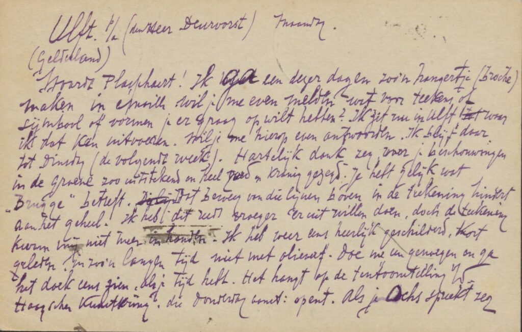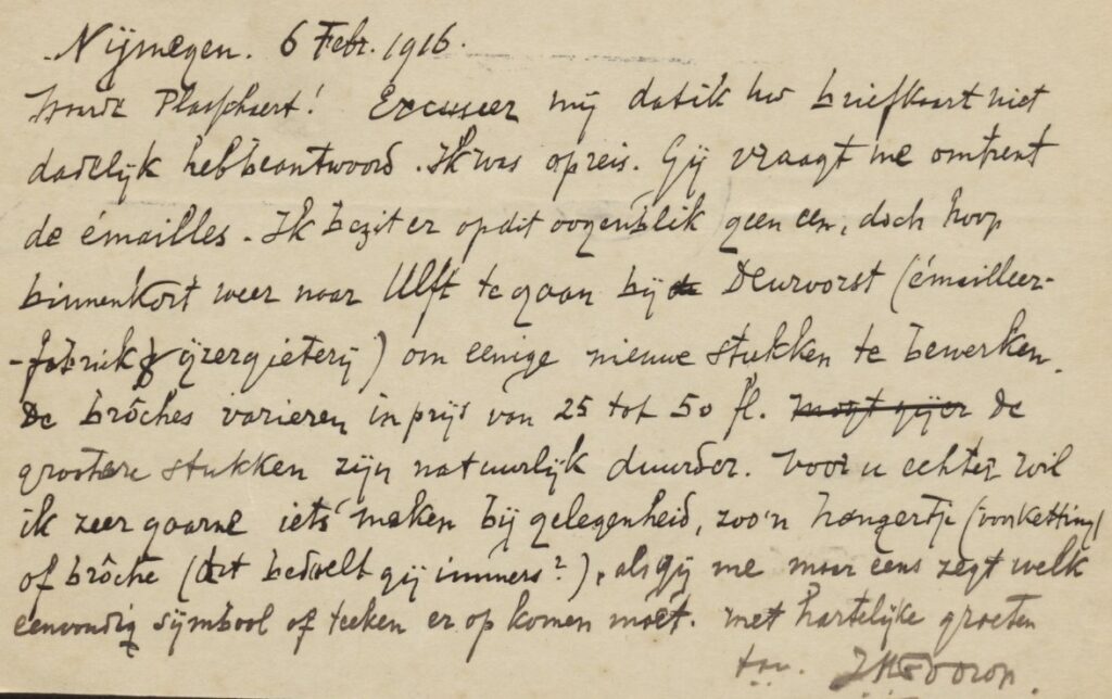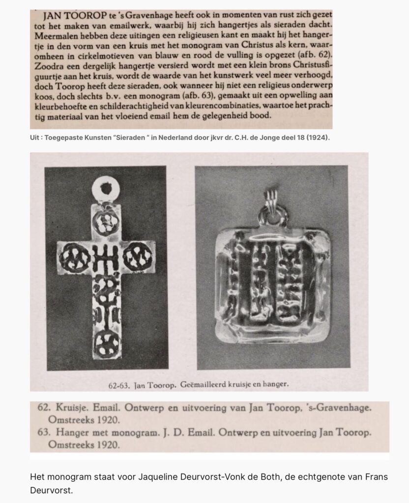 Toorop had Albert Plasschaert (1874-1941) beloofd enkele geëmailleerde broches te maken in Ulft bij Deurvorst -emailleerfabriek/ijzergieterij. Hij vraagt hem welk eenvoudig symbool of teken erop moest komen. Het lijkt op een wat vleiende enigszins “0vergedienstige” toon geschreven. “Voor u echter wil ik zeer gaarne iets maken bij gelegenheid, zo’n hangertje voor een ketting of broche dat bedoelt gij immers?.